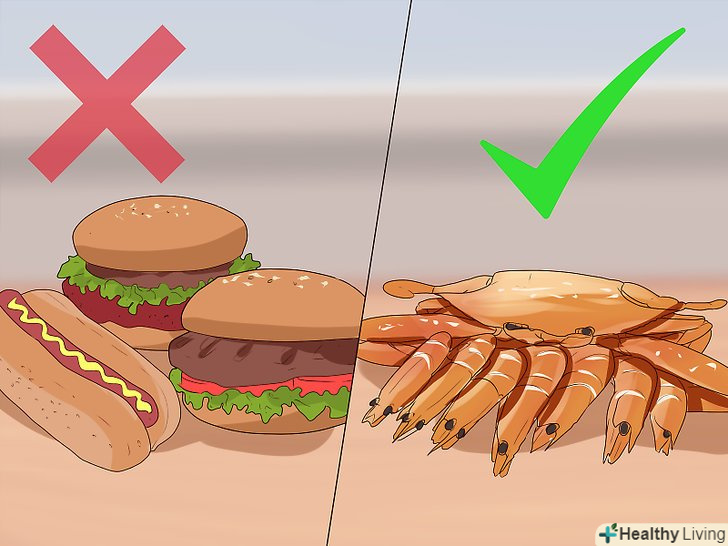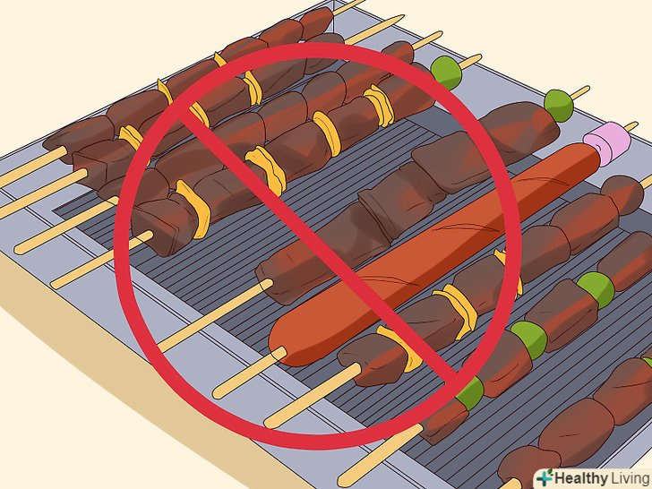 Замість гамбургерів і хот-догів віддайте перевагу морепродуктам.гамбургери і хот-доги те саме шашликам: м'ясо в них не пісне, а приправи і булочки висококалорійні. Замість них віддайте перевагу морепродуктів на грилі, наприклад, креветок або лососю. Якщо в меню немає морепродуктів або вам вони не подобаються, тоді пошукайте більш пісне м'ясо, наприклад, курячу грудку або індичку, приготовані на грилі.[9]- Посмажте на грилі морепродукти або пісні види м'яса, щоб приготувати більш здорову їжу.