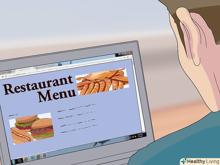 Перевірте меню, перш ніж вибрати ресторан.якщо ви перебуваєте в іншому місті і хочете сходити в ресторан або добре провести час на терасі в кафе, яке розташоване недалеко від будинку, вам варто провести невелике дослідження. Знайдіть в Інтернеті меню ресторану і спробуйте знайти страви, які відповідають вашому харчуванню. Якщо ви будете заздалегідь знати меню, то зможете уникнути спокуси вибрати більш калорійне блюдо.[10]- Віддайте перевагу ресторанам, в меню яких вказані здорові страви. Уникайте продуктів швидкого приготування і шведських столів.
