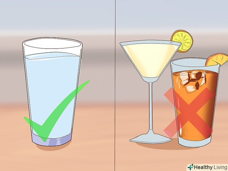 Зменшіть споживання спиртного.якщо ви все ж будете пити спиртне, віддайте перевагу низькокалорійним напоям, на зразок сухого вина, світлого пива або коктейлів без калорійних компонентів, наприклад, горілці з содовою і лаймом. Алкоголь також пригнічує почуття стримування, так що чим більше ви будете пити, тим більша ймовірність, що ви з'їсте шкідливу їжу.[7]- Намагайтеся не пити до п'ятої години вечора, навіть якщо у вас відпустку. Якщо ви рано вип'єте, то ризикуєте провести весь залишок дня в неробстві.