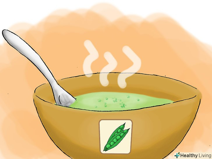 Спробуйте гороховий суп.горох-це "супер-їжа". Всього один стакан гороху містить 16.3 г протеїну![2] гороховий суп - не єдине блюдо, яке можна приготувати з гороху. Ось ще кілька ідей для використання гороху:- Веганське печеня з фундуком і горохом