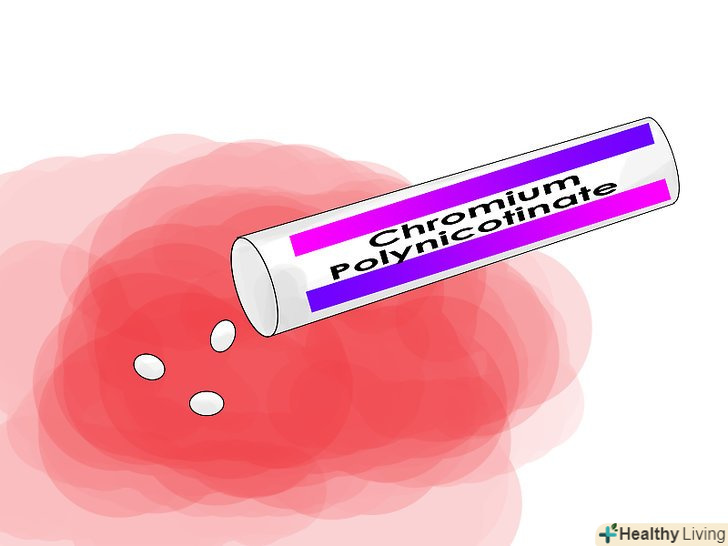 Додайте Полінікотинат хрому в ваш раціон.Полінікотинат хрому являє собою хром, пов'язаний з ніацином, інакше відомий як вітамін B3 . Цей вітамін допомагає регулювати рівень глюкози при стабілізації рівня цукру в крові. Приймайте 200 мг один раз на день перед їжею. [8]