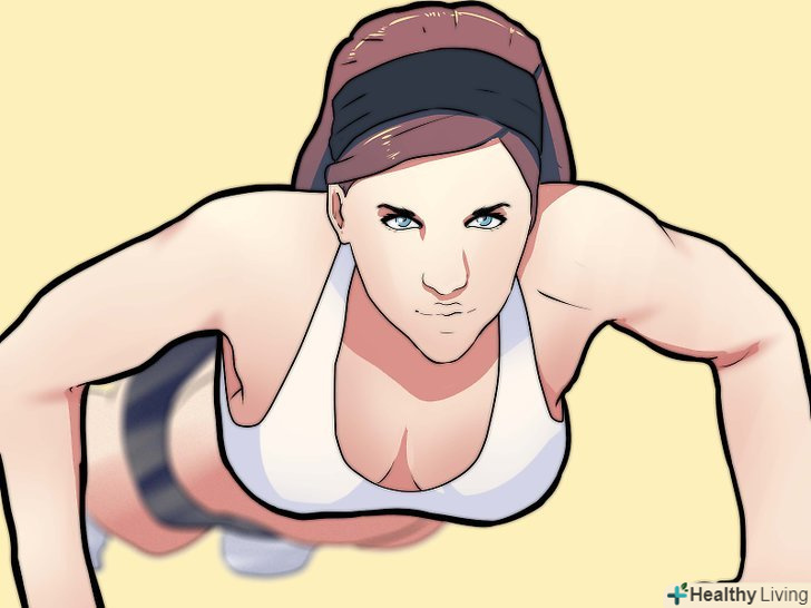 Віджимайтеся кожен день.Станьте в пряму позицію, упріться на руки і ноги, створюючи пряму лінію від плечей до стегон і щиколоток.- Якщо у вас не дуже сильні руки, то упріться на коліна, таким чином роблячи пряму лінію від плечей до колін.[1]