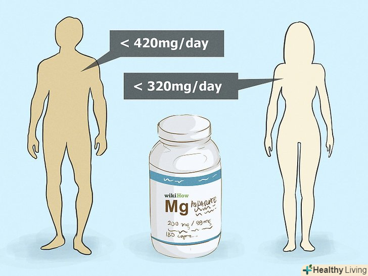 Визначте, яка кількість магнію, вам необхідно споживати.ця кількість залежить від віку, статі та інших факторів. В цілому, чоловіки не повинні споживати більше 420 мг на день, а жінки-більше 320 мг.- Рекомендується проконсультуватися з лікарем з приводу прийому добавок з магнієм, особливо, якщо вам здається, що ваш організм відчуває нестачу в цьому елементі