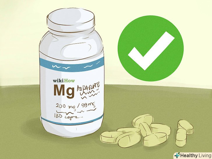 Виберіть харчову добавку з магнієм.якщо ви все-таки вирішили приймати харчову добавку, то вибирайте ту, яка містить легко засвоюваний магній. Ви можете вибрати будь-яку добавку, що містить наступні речовини:[14]- Аспартат магнію. Це з'єднання магнію з аспарагінової кислотою. Аспарагінова кислота являє собою амінокислоту, яка міститься в багатьох продуктах, багатих білком, завдяки чому магній всмоктується краще.[15]
