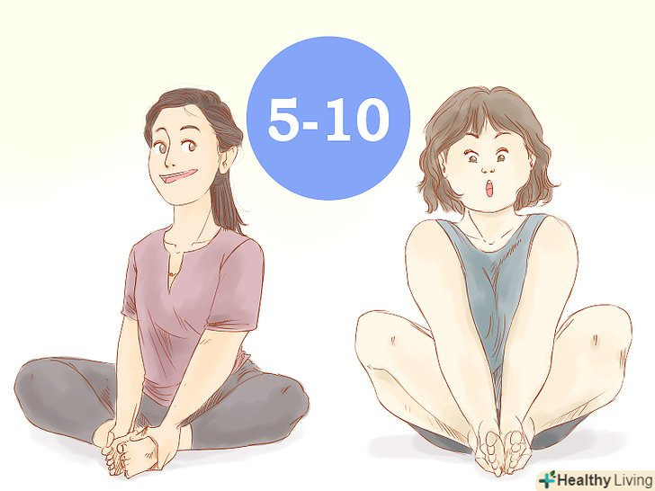 Спробуйте вправу на розтяжку "метелик".Сядьте на підлогу, спина рівна. Коліна зігніть і розведіть в різні боки так, щоб з'єднати разом стопи. Стопи підтягніть якомога ближче до тазу, дивіться, не потягніть ногу. Спробуйте опустити стегна так, щоб вони були паралельні підлозі. Затримайте їх в такій позиції на 10 секунд.- Щоб зробити розтяжку, вам, можливо, доведеться тримати ступні руками. Це нормально!