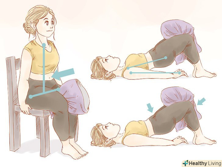 Робіть жими внутрішньою частиною стегна.ви можете робити цю вправу, сидячи за столом або ускладнити його, сівши на підлогу.- Жим сидячи: сядьте на стілець рівно, спина рівна, живіт втягнутий. Затисніть між колін рушник, подушку або інший невеликий предмет. Стисніть його колінами якомога сильніше і тримайте кілька секунд. Зробіть 20 повторень.