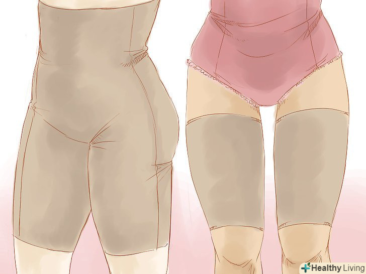 Надіньте коригуючу білизну.якщо просвіт між стегон вам потрібен сьогодні ж, то кращий варіант-це надіти коригуючий білизна для стегон.- Найкраще підійде хороша пара стягуючих проблемні місця колготок. Будь-які потягуючі речі були досить довгими, щоб закрити стегна.