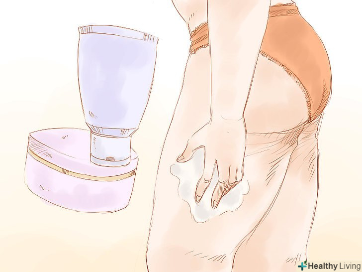 Спробуйте крем від целюліту.такі креми і косметичні мазі при постійному використанні допомагають позбутися целюліту. Через те, що велика частина жиру це і є целюліт, такі креми потенційно можуть бути дійсно корисними.- Багато з цих кремів містять кофеїн. Кофеїн стимулює кровообіг і може допомогти позбутися целюліту-якщо ви будете наносити крем проти целюліту з кофеїном на стегна, це допоможе вирішити проблему.