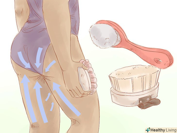 Подумайте про сухе чищення тіла.це процес полягає в тому, щоб натирати стегна спеціальною щіткою для стимулювання кровообігу і прискорення втрати жиру.- Використовуйте щітку, спеціально розроблену для цієї методики. Ці щітки можна купити в магазині товарів для краси і здоров'я. Не використовуйте звичайну щітку для волосся.
