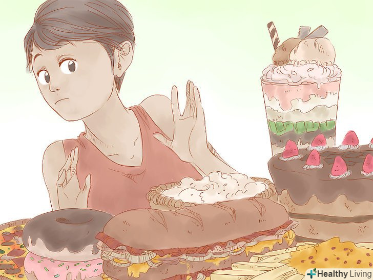 Відмовтеся від жирної їжі.замість того, щоб обмежувати вживання їжі, постарайтеся вживати здорову їжу, яка буде живити ваш організм (і не перетворить вас на ласуна). Подумайте про те, щоб прибрати виключити продукти з вашого раціону:- Транс-жири: вони викликають серцеві захворювання і підвищують рівень холестерину. Такі жири містяться в фастфуді, чіпсах, смаженої їжі, розпушувачі і маргарині. Якщо ви не впевнені, чи містить продукт транс-жири, уважно прочитайте склад на упаковці.