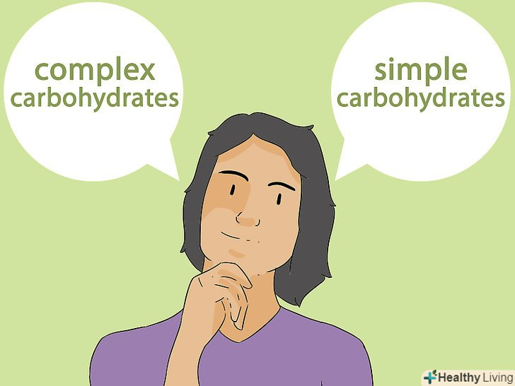 Зрозумійте різницю між складними і простими вуглеводами. прості вуглеводи-це вуглеводи, які складаються з однієї або двох молекул цукру, які мають невелику харчову цінність. Складні вуглеводи складаються з ланцюжка цукрів, але дуже багаті клітковиною і містять корисні вітаміни і мінерали.[7]- Приклади простих вуглеводів: цукор, сиропи, джеми і цукерки.