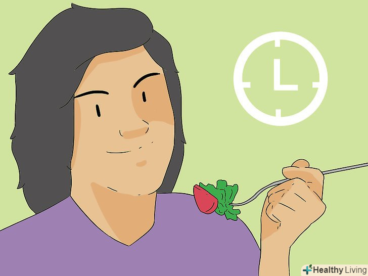 Знайте, коли є.дійсно важливо не пропускати прийоми їжі. Багато людей думають, що схуднуть, якщо пропустять прийом їжі, але це невірно. Насправді ж, відмова від прийому їжі уповільнює швидкість метаболізму і може привести до втрати поживних речовин, необхідних вашому організму.[8] ось кілька прикладів корисних прийомів їжі і перекусів, а також часу їх споживання:- Легкий сніданок: яєчні білки (ви можете змішати яєчні білки з овочами, такими як цибуля або гриби і т.д.) з грейпфрутом і шматочком тосту.