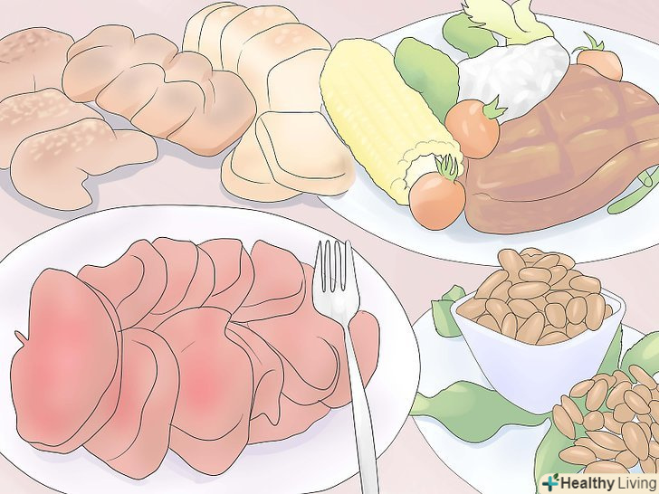 Додайте в свій раціон пісне м'ясо, нежирні молочні та цільнозернові продукти.з фруктами і овочами необхідно поєднувати деякі інші продукти, при цьому ваш раціон повинен залишатися збалансованим. Коли ви будете купувати м'ясо, молоко, сири і макарони, переконайтеся, що ви вибираєтенежирне м'ясо, молочні продукти з низьким вмістом жиру і пасту з твердих сортів пшениці. Це означає, що вам підійде біле м'ясо( без шкіри), знежирене молоко або молоко з низьким вмістом жиру, сир, йогурт і коричневі цільнозернові макарони, Лобода і овес.- Коли справа стосується злаків, краще вибирати коричневі злаки. Білі злаки не повинні бути присутніми у вашому раціоні. Вони, як правило, піддаються обробці і всі поживні речовини губляться. В такому випадку це просто порожні вуглеводи.