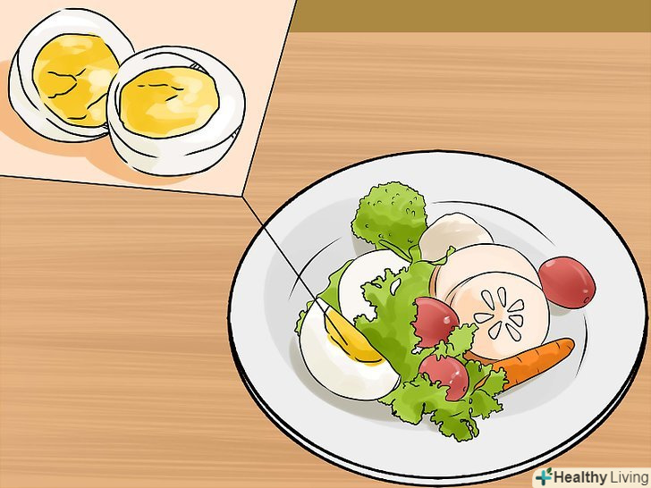 Наситьте їжу калорійними інгредієнтами.ви можете продовжувати їсти їжу, яку зазвичай їсте, але додайте в них кілька інгредієнтів, які б сприяли збільшенню ваги. Ви можете зробити наступне:[18]- Додавайте в салати яйця, зварені круто.
