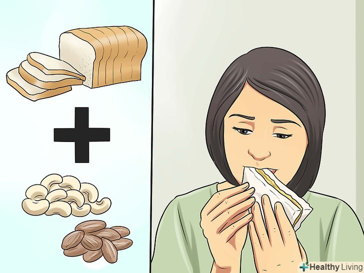 Їжте протягом усього дня.анорексія часто пов'язана з неправильними звичками харчування. Вашому організму протягом усього дня потрібні джерела енергії, особливо якщо ви намагаєтеся відновити нормальну вагу, загублений внаслідок анорексії. Щоб набрати вагу правильним і здоровим способом, харчуйтеся регулярно, з проміжками 3-4 години між прийомами їжі.[16]- Частіше перекушуйте. Не забувайте регулярно харчуватися, додатково перекушуючи між прийомами їжі; їжте, як тільки відчуєте голод – це допоможе вам розпізнавати сигнали свого шлунка. Привчіться злегка перекушувати здоровими закусками протягом усього дня. Тим самим ви збільшите число споживаних калорій, не перевантажуючи свій шлунок.