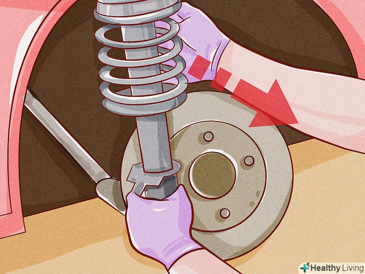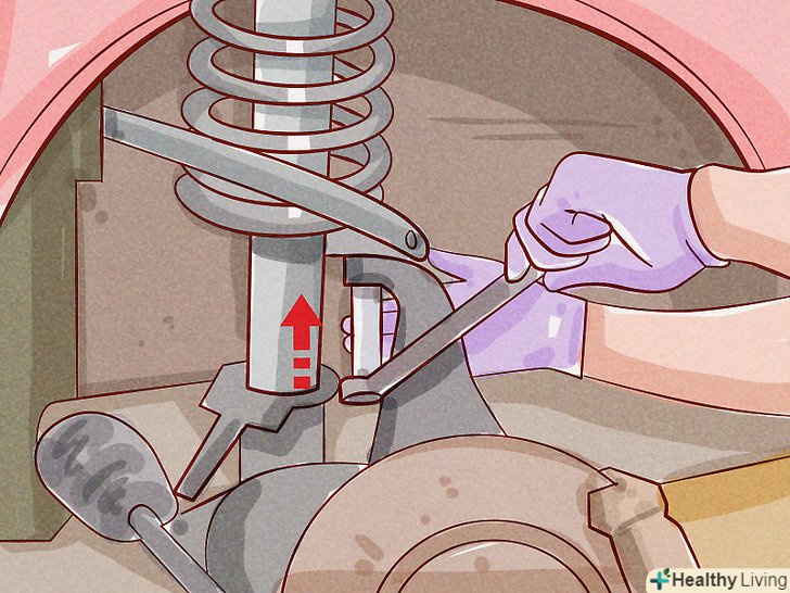 Зніміть болти з поворотного кулака.швидше за все, стійки приєднані до поворотного кулака за допомогою двох-трьох великих болтів. Видаліть їх, відкрутивши гайки і послабивши стійку.- Вони часто іржавіють, в зв'язку з чим буває складно їх відкрутити. Ви можете використовувати спрей WD-40, розпилюючи його на болти, перш ніж ви відкрутити їх. Спробуйте кілька разів вдарити молотком по самому поворотному кулаку, щоб трохи послабити конструкцію, а потім вдарити молотком по самих болтах, які поєднують стійку з поворотним кулаком. Для цього може знадобитися трохи жирної мастила.
