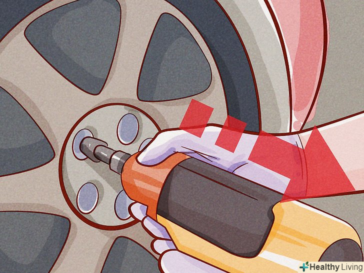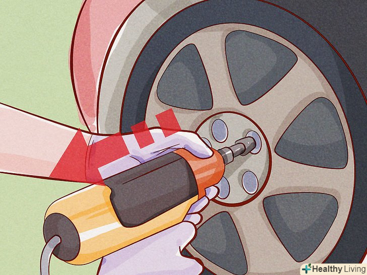 Встановіть колесо.перш ніж опустити автомобіль, затягніть колісні болти. Домкратом злегка підніміть автомобіль, щоб зняти навантаження з козел, потім приберіть козли і опустіть автомобіль на землю. Затягніть колесо відповідно до вказівок, а також гайки амортизаційної стійки.