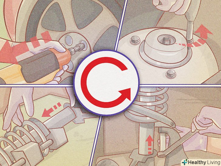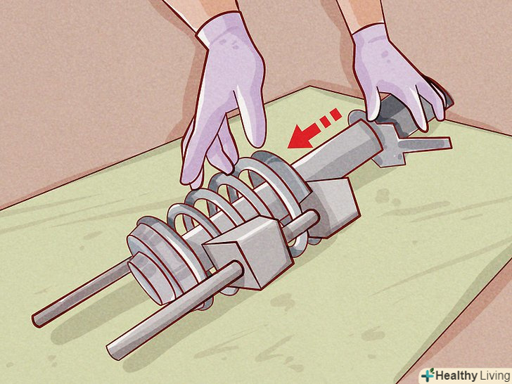 Зніміть старі стійки.не відкручуйте центральну гайку у верхній частині стійки, поки ви не стиснете пружини. Якщо у вас є стійка в зборі, можна відмовитися від розбирання старої стійки і пропустити цей крок, приступаючи до установки нової стійки в зборі.- Новачкам рекомендується спершу спробувати стиснути пружини на старій стійці за допомогою пружинного компресора або пружинних затискачів. Цей метод використовується, щоб заощадити гроші, зберігши стару пружину і встановивши її на нову стійку, але якщо у вас немає свого компресора для стиснення пружин, його покупка обійдеться вам приблизно $ 700. Краще витратити ці гроші на стійки в зборі, які попередньо зібрані і вимагають тільки установки на автомобіль.