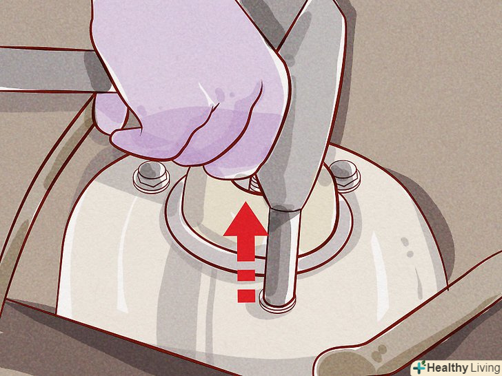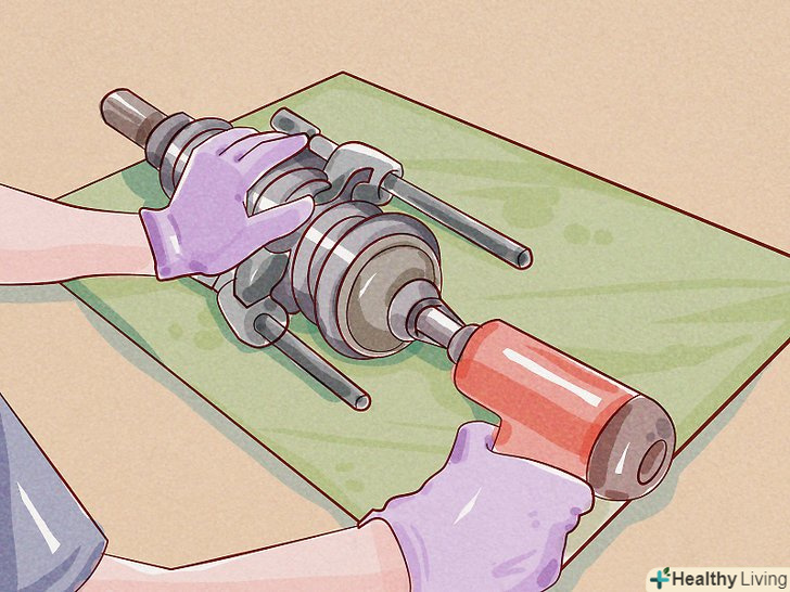 Зніміть колесо.спочатку послабте болти, що кріплять колесо, за допомогою балонного ключа і підніміть автомобіль домкратом, встановивши домкрат відповідно до інструкцій по заміні шин в керівництві по експлуатації. Як тільки автомобіль буде піднятий, встановіть під машину козли для стійкості. Зніміть болти, які кріплять колесо, і демонтуйте його.- Важливо завжди використовувати козли, щоб надійно закріпити машину. Не намагайтеся зробити цю роботу, використовуючи тільки домкрат. Домкрат може зрушити і машина і придавить вас. Автомобільний домкрат працює за допомогою гідравлічної сили, яка може ослабнути, тому підставте козли, щоб убезпечити себе. Придбайте пару козел, вони будуть корисні ще не раз.