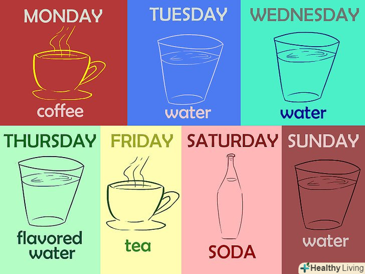 Будьте непохитні.не дозволяйте собі повертатися до поганих звичок тільки тому, що Ви втомилися або вам хочеться солодкого. Приносьте напої з собою, якщо встановлений на робочому місці торговий автомат постійно спокушає вас. Вода повинна стати основним інгредієнтом. Не дозволяйте собі пристраститися до нових напоїв (чаю, кави та ароматизованої води).[10]