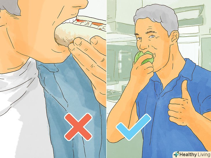 Підрахуйте, скільки разів ви перекушуєте протягом дня.багато людей не помічають, як часто вони їдять протягом дня. Жменя горіхів тут, печиво там і велика пачка чіпсів перед телевізором наберуть досить багато калорій. За допомогою щоденника харчування ви зможете визначити, чи здорове у вас ставлення до перекусів.- Чи схильні Ви вибирати корисні продукти для перекусу або їсте те, що попадеться під руку? Якщо ви часто поспішаєте і у вас немає часу готувати свіжу їжу кожен раз, коли потрібно перекусити, спробуйте продумати меню заздалегідь і взяти їжу з собою — тоді вам не доведеться спішно шукати що-небудь, коли зголоднієте.