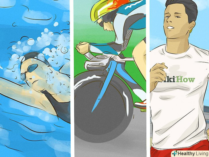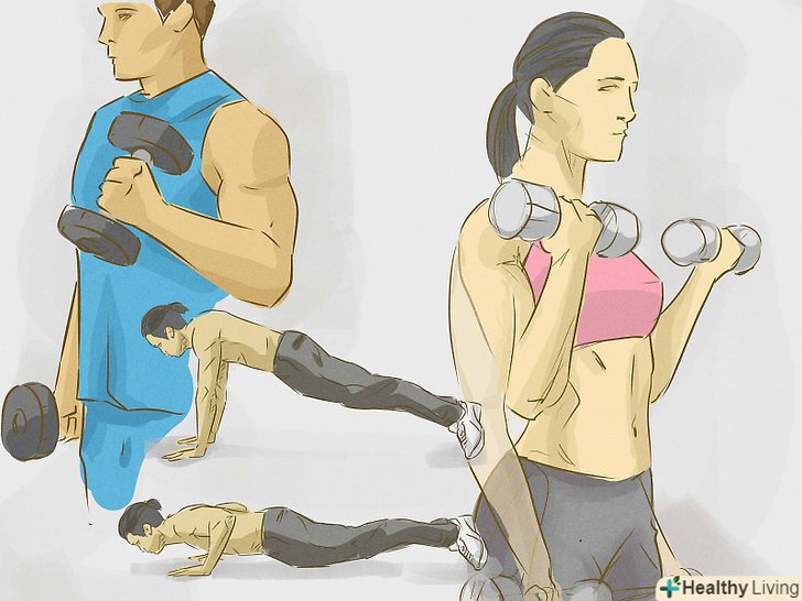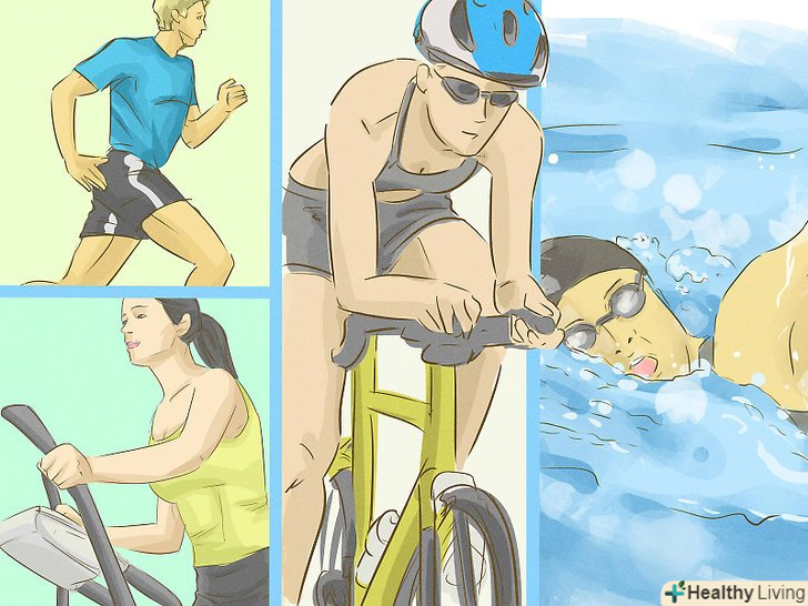 Спробуйте виконувати різні види вправ.щоб тренування не набридали, виконуйте найрізноманітніші вправи. Це дозволить уникнути надмірного навантаження на певні групи м'язів і перевтоми.[17]- Якщо вам не подобається займатися в залі, запишіться на танці або почніть грати в спортивні ігри. Ви з більшою ймовірністю будете відвідувати тренування, якщо заняття буде вам до душі.