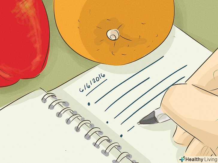 Фіксуйте все з'їдене вЩоденнику харчування.Приступаючи до нової дієти або змінюючи харчові звички, може бути корисно записувати всі свої звички і з'їдену їжу в щоденнику, щоб бачити, що потрібно змінити. Записуйте їжу і напої, а також час прийому їжі.- Купуйте щоденник або встановіть спеціальний додаток на телефон. Ведіть щоденник якомога довше. В ідеалі слід записувати інформацію як у будні, так і у вихідні дні. Багато людей по вихідних їдять трохи інакше, ніж по буднях, коли графік чітко зафіксований.[2]