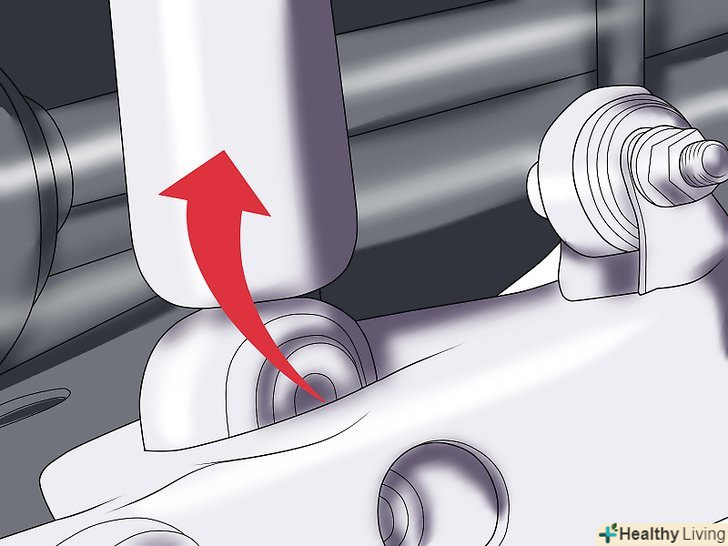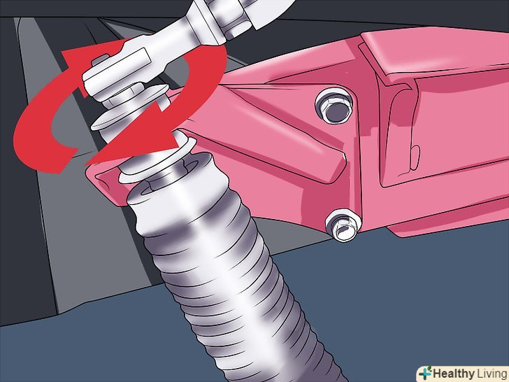 Від'єднайте амортизатори від підвіски.торцевим ключем відкрутіть гайку, що кріпить амортизатор до підвіски, і зніміть болт. Якщо не виходить-використовуйте гайкорез. Якщо не вистачає місця, щоб застосувати ключ з довгою ручкою, ви можете змастити гайку, а потім нагріти її, щоб полегшити відкручування.- Залежно від конструкції, можливо, вам доведеться від'єднати шарнір зверху гальмівного супорта, щоб дістатися до амортизатора. Дізнайтеся, чи потрібно це робити, вивчивши інструкцію до автомобіля. Відкручуйте гайки тим же способом, який описувався раніше, зберігайте окремо і намагайтеся не переплутати гайки, відкручені з різних місць.[1]