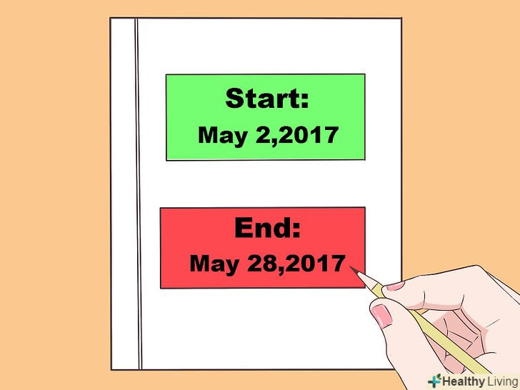 Записуйте.позначте на календарі перші і останні дні менструації. Таким чином, ви будете знати, коли наступного разу почнеться менструація. [4] зазвичай місячні починаються через кожні 28 днів, але якщо ви фіксуєте початок і закінчення місячних, то зможете точно визначити тривалість свого циклу.