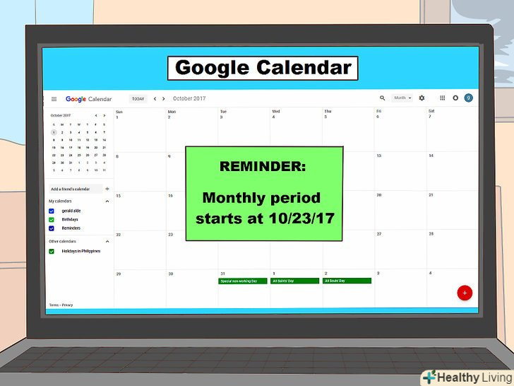 Використовуйте онлайн-календар.встановіть Календар Google і включіть нагадування про початок наступної менструації. Таким чином, ви можете фіксувати в календарі тривалість ваших циклів, потім порівнювати їх. Це допоможе вам дізнатися, якщо будуть відхилення від норми, а також бути готовою до настання наступних місячних.