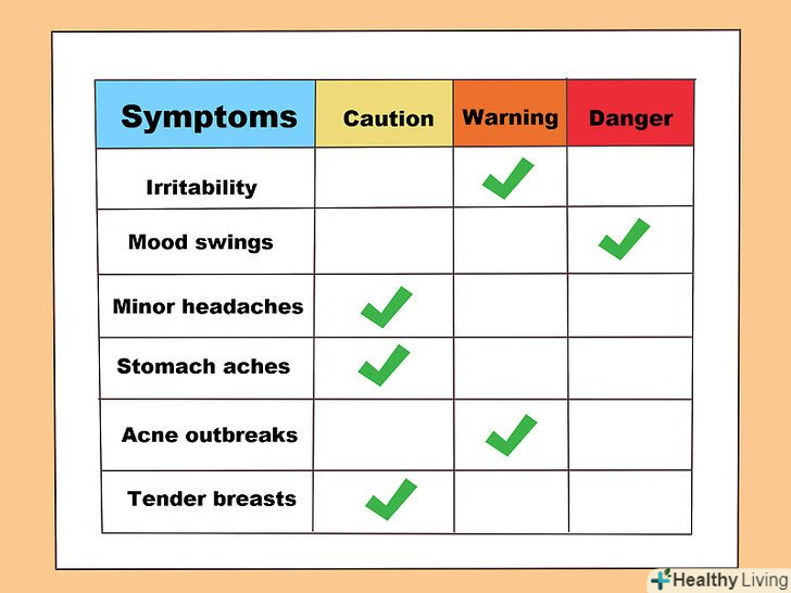 Запишіть свої власні симптоми.цикл кожної жінки унікальний. Запишіть симптоми, які ви відчуваєте до і під час кожного менструального циклу, щоб допомогти визначити початок наступного циклу. Розпізнавайте попереджувальні симптоми, які часто передують початку циклу. Записуйте симптоми кожного дня місячних.