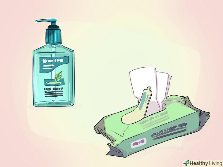 Дотримуйтесь гігієни.якщо ви знаєте, що туалет, куди вам доведеться піти, брудний або взагалі відсутній, майте під рукою кілька речей, які допоможуть вам залишитися чистою.- Дезінфікуючий засіб для рук. Перед тим, як ви будете мочитися стоячи, дуже важливо вимити руки. Ви будете торкатися до області статевих органів і важливо, щоб мікроби з ваших рук не потрапили туди і не викликали інфекцію сечових шляхів. Через те, що у жінок короткі уретри, мікробам дуже просто опинитися в сечовому міхурі.[3] якщо мило та вода недоступні, використовуйте дезінфікуючий засіб для рук, щоб захистити себе.