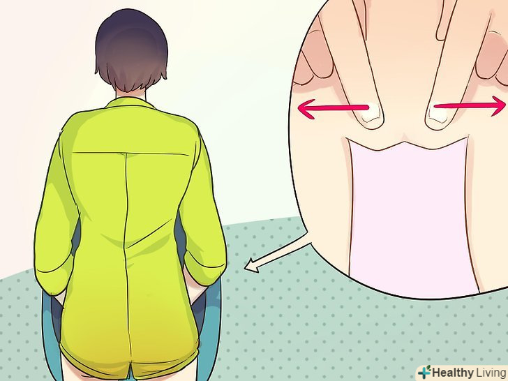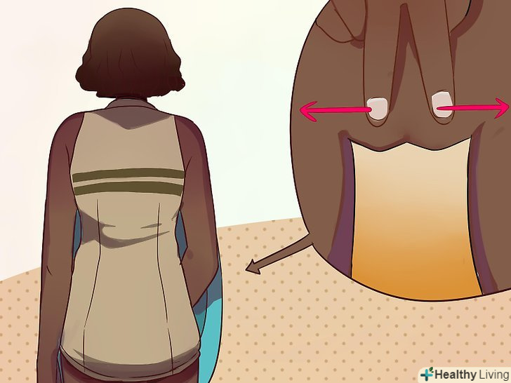 - Першим і другим пальцем іншої руки сформуйте букву " V " і розсуньте статеві губи, потягнувши вгору. Потрібно розсунути статеві губи настільки, щоб сеча йшла потоком вперед, а не бігла вниз по нозі. Регулюючи розтягнення статевих губ, а також рухаючи стегнами, ви можете контролювати рух потоку (хоча для цього буде потрібно трохи практики).[4]