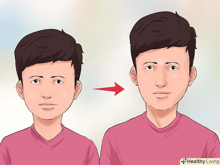 Перевірте, чи не з'явилася у вас легка або помірна вугрі.вугри-досить неприємне явище, проте це абсолютно природна частина періоду статевого дозрівання. Високий рівень гормонів у вашому тілі може привести до висипань в тих місцях, де до цього не було жодного прища. Частково причина в тому, що ваші сальні залози стають більш активними в пубертатний період, що призводить до рясного потовиділення, а це, в свою чергу, робить вашу шкіру схильною до появи вугрів. У більшості хлопчиків висипання виникають одночасно з ростом волосся під пахвами.[10][11]- У міру того як ваша шкіра стає більш жирною, ви можете виявити, що варто частіше приймати душ, щоб виглядати і відчувати себе чистим.