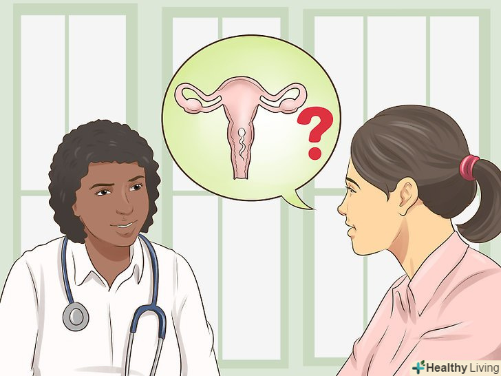 Визначте проблеми з репродуктивною системою.навіть при відсутності гострих симптомів міома матки все ще може викликати проблеми з дітонародженням. Якщо у вас виникли проблеми із зачаттям, це може бути викликано міомою матки. Врахуйте, що безпліддя також може бути викликано і іншими проблемами зі здоров'ям. [3]- Якщо у вас спостерігаються проблеми із зачаттям, вам варто проконсультуватися з лікарем. Лікар візьме у вас аналізи і визначить наявність або відсутність медичних причин, що не дозволяють вам завагітніти.