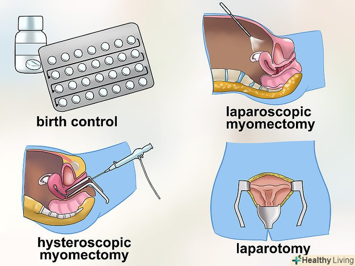 Погодьтеся на лікування.залежно від типу міоми і ступеня тяжкості, лікар призначить вам курс лікування. Це може включати видалення міоми. Незважаючи на те, чи буде проведена операція чи ні, лікар призначить вам ліки для зменшення міоми і лікування симптомів.- У більшості випадків лікар призначає знеболюючі, протизаплідні і гонадотропін-вивільняють гормони, які повинні уповільнити або зупинити зростання міоми. Протизаплідні таблетки зменшать кровотечу, якщо воно є одним із симптомів міоми.[7]