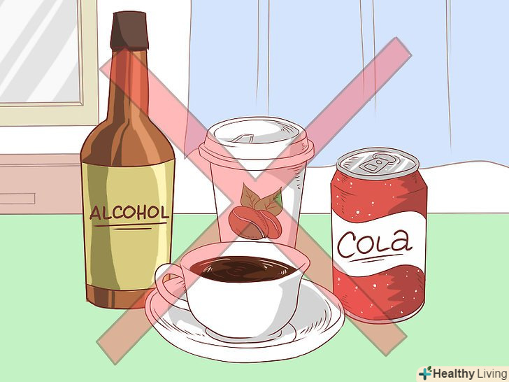 Вживайте менше кофеїну і алкоголю.багато хто вважає, що зниження споживання цих видів рідин знижує болючість спазмів. У дні перед місячними намагайтеся пити менше кави та алкогольних напоїв. Намагайтеся повністю виключити їх, якщо ви вже відчуваєте спазми. [6]- Якщо у вас сильні спазми, вам варто задуматися про те, щоб повністю відмовитися від кофеїну і алкоголю, а не тільки в період менструації.