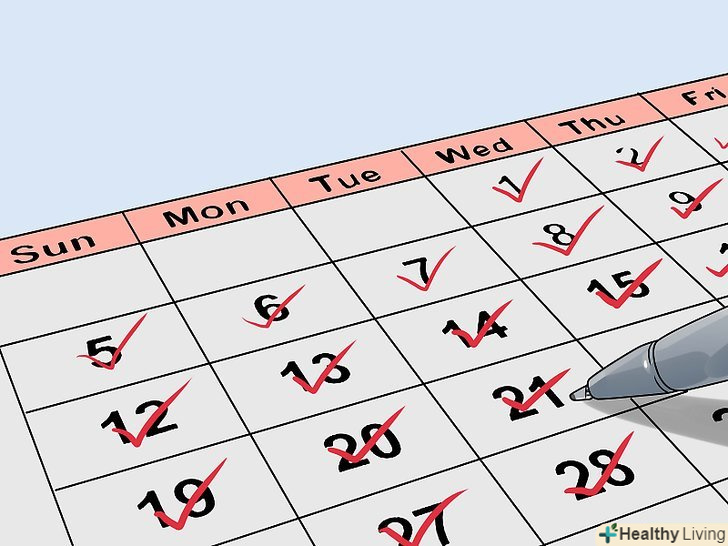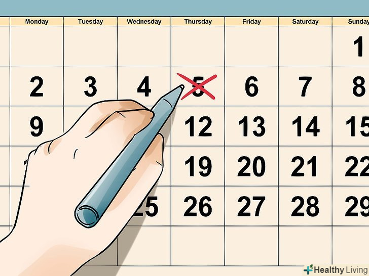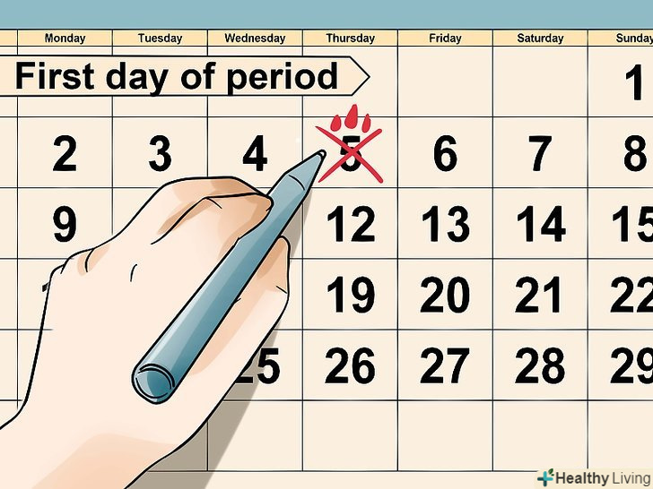 Навчіться визначати перший день циклу.якщо ви навчитеся правильно рахувати дні циклу, ви зможете приймати правильні рішення щодо свого здоров'я і планування сім'ї. Щоб визначити перший день циклу і його тривалість, почніть нумерувати дні циклу, починаючи з першого дня менструації.[3]- Перший день циклу-це перший день менструації. Відзначте цей день хрестиком в календарі.[4]