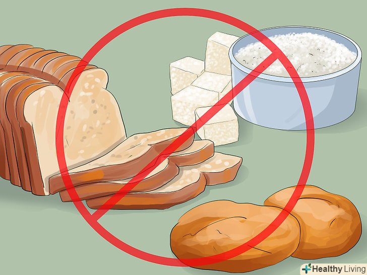 Їжте менше вуглеводів і цукру.намагайтеся якомога частіше уникати швидких вуглеводів і цукру - ці продукти викликають скачки рівня глюкози в крові.[3] існує зв'язок між симптомами передменструального синдрому і низьким цукром в крові (гіпоглікемією), що було доведено дослідженнями. Може здатися, що потрібно їсти більше цукру і вуглеводів, щоб підвищити цукор в крові, але це призведе до протилежного ефекту. Через дві години рівень цукру різко впаде, коли інсулін переробить всю глюкозу в крові.- Часто під час місячних жінкам хочеться шкідливої їжі. Можливо, вам здається, що чізбургер або шматочок торта допоможуть вам відчути себе краще, але насправді така їжа лише посилить втому. Намагайтеся побороти бажання з'їсти щось шкідливе і вибирайте корисну їжу.