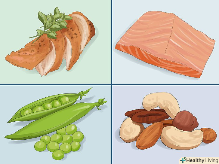 Їжте більше білка.білок сприяє виробленню ензимів і гормонів, які допомагають людині відчувати себе енергійним. Нежирний білок також дозволяє підтримувати постійний рівень цукру в крові і уникати різких стрибків і падінь, які можуть посилювати втому.[2] корисний білок міститься в наступних продуктах:- Птах (курка, качка, індичка)
