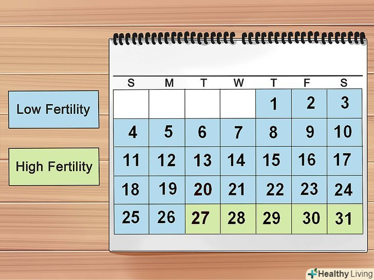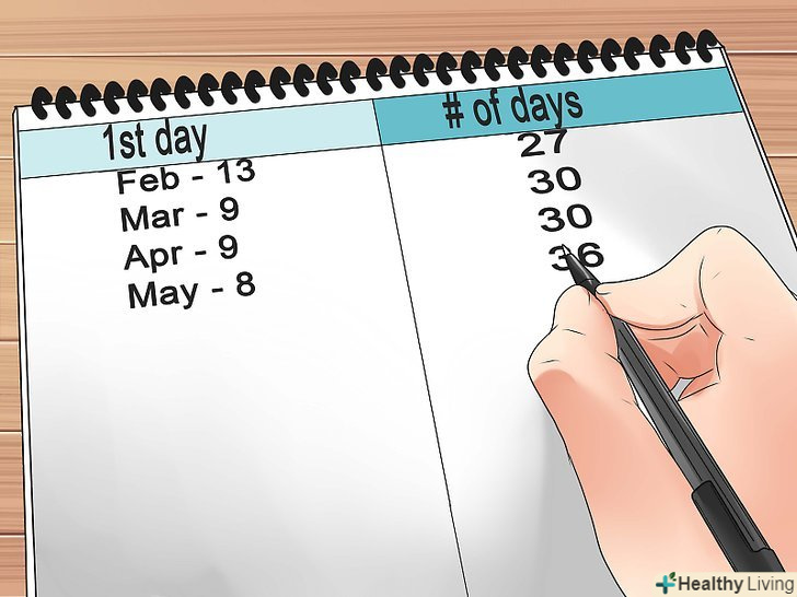Відстежуйте свій менструальний цикл, використовуючи і інші методи.це не найточніший метод, але це простий і корисний крок, який варто зробити, відстежуючи і інші дані.[1] купуйте або створіть календар, щоб почати відстежувати свої місячні менструальні цикли. Обводите перший день циклу, а це день, коли у вас почалися місячні. Слідкуйте за тривалістю циклу, яка, як правило, становить в середньому 28 днів.- Відзначайте кількість днів в кожному циклі, включаючи і той день, коли у вас почалися місячні. Останній день кожного циклу - це день перед початком наступних місячних.