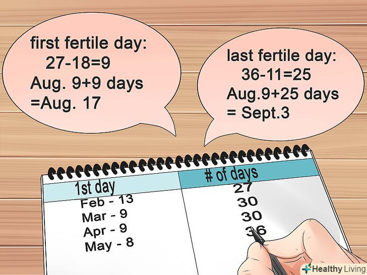 Використовуйте свою таблицю, щоб спрогнозувати період фертильності в поточному циклі. важко визначити точний день овуляції, використовуючи тільки календарний метод. Календар корисний для визначення ряду днів, коли ви будете фертильні, їх кількість для кожної жінки може бути різним. Для визначення цих днів необхідно:[2]- Спрогнозувати перший фертильний день у поточному циклі, знайшовши найкоротший цикл у своїй таблиці. Відніміть вісімнадцять із загальної кількості днів у цьому циклі, щоб знайти перший фертильний день, тобто перший день, коли може відбутися зачаття. Наприклад, якщо ваш найкоротший цикл тривав 26 днів, вашим першим фертильним днем буде восьмий день кожного циклу (26 - 18 = 8). Відлік потрібно починати з першого дня місячних.