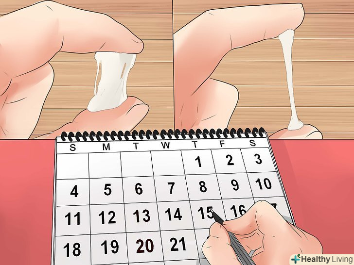 Слідкуйте за змінами цервікального слизу. щоб дізнатися, як перевіряти цервікальний слиз, прочитайте нашу статтю як перевірити цервікальний слиз. Перевіряйте її кожен день після закінчення місячних, і звертайте увагу на виразні зміни, які відбуваються протягом менструального циклу. Відзначайте ці зміни в календарі.- Відзначайте дні менструальних виділень, сухі дні і дні, коли слиз стає клейкою, липкою, слизькою або мокрою.