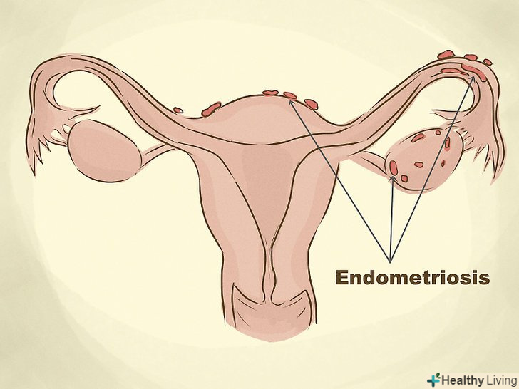 Дізнайтеся у лікаря про ендометріоз.[15] ендометріозом називають захворювання, при якому тканини матки розростаються за межі області матки в черевну порожнину. Як правило, це розростання відбувається в область таза, а це означає, що тканини матки розростаються на область яєчників і в Інші частини області таза, навіть в нижні відділи кишечника. Щомісяця під час менструації ці тканини запалюються, через що в нижній частині живота виникають болі. Такі болі бувають досить сильними і заважають повсякденній діяльності. Знеболюючих засобів і лікування гормональними препаратами може бути недостатньо, щоб зменшити біль при ендометріозі. Це захворювання вимагає ретельної лікарської діагностики та медичного втручання.- Якщо у вас є підозри, що у вас ендометріоз, то необхідно звернутися до лікаря-гінеколога, який перед постановкою діагнозу призначить певні аналізи та обстеження.