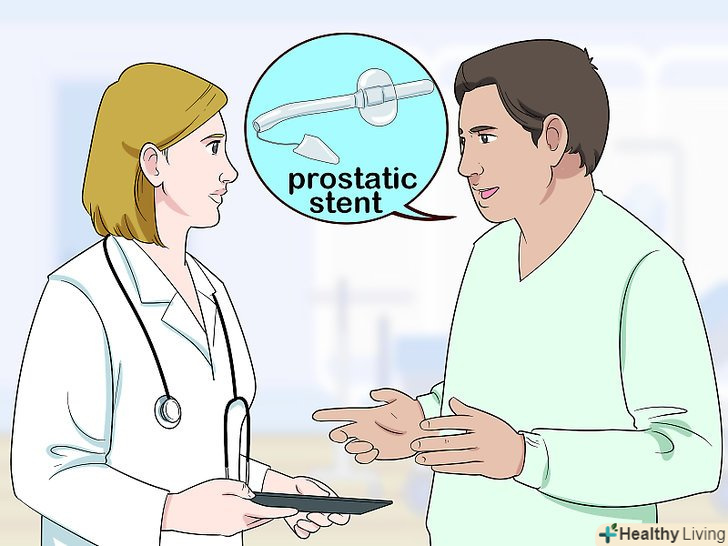 Проконсультуйтеся з приводу простатичного стента, якщо операції або препарати вам не підходять.Поговоріть з лікарем про простатичний стент-це невелика трубка, яка вставляється в уретру, щоб остання залишалася відкритою. У більшості випадків лікарі вважають за краще не використовувати стенти, але якщо у вас серйозне збільшення простати і ви не хочете боротися з симптомами за допомогою препаратів або процедур, то цей варіант може бути відповідним.[18]- Стенти з часом можуть змінити своє положення, що призводить до дискомфорту або інфекції сечовивідних шляхів. Крім того, їх буває важко видалити, якщо виникають проблеми.