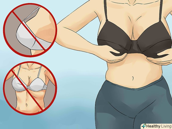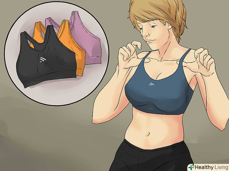 Придбайте собі відповідний спортивний бюстгальтер.якщо повсякденні бюстгальтери вам не підійдуть, можна звернути свою увагу на їх спортивні аналоги. І якщо ви вирішили купити саме такий бюстгальтер, вам слід врахувати ряд важливих моментів. По-перше, жоден спортивний бюстгальтер не знерухомить ваші груди під час занять спортом і виконання вправ, але допоможе мінімізувати її руху, щоб забезпечити вам комфорт. Підбір розміру спортивного бюстгальтера нічим не відрізняється від звичайного і визначається розміром пояса і чашок. Якщо ви вже знаєте свій розмір, прекрасно, а якщо ні, то продавець-консультант допоможе Вам зняти мірки. Визначившись з розміром, можна зайнятися вибором моделі, яка вас цікавить.[7]- Компресійний або підтримуючий бюстгальтер. Компресійні бюстгальтери буквально притискають груди до тіла, щоб не допустити істотних коливань. Однак, зазвичай вони ефективні лише для жінок з невеликими грудьми і навантажень низької інтенсивності. З іншого боку, підтримуючі бюстгальтери оснащені формованими чашечками, які краще фіксують на місці пишні груди, ніж бюстгальтери компресійного типу.