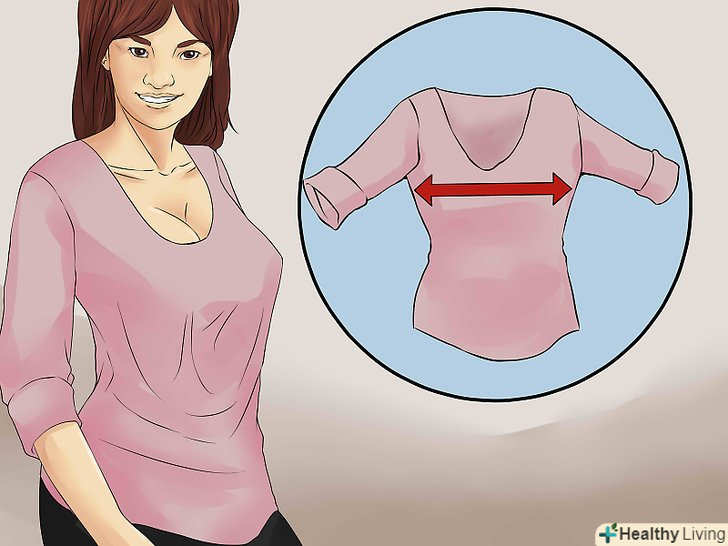 Навчіться правильно підбирати одяг для великих грудей.з великими грудьми часом важко одягатися елегантно. Купуючи блузки, слід звертати увагу на подовжені моделі. Додаткова довжина блузки дозволить візуально подовжити верхню частину тіла і звузити талію, надавши вашій фігурі більш збалансований вигляд. Також корисними будуть рукава довжиною в три чверті, так як вони природним чином відволікають погляди від грудей. Залежно від розміру грудей, можливо, ви також захочете відмовитися від топів на вузьких бретелях. Що стосується лінії горловини, шукайте одяг з V-подібним або іншим глибоким вирізом. Глибокий виріз робить великі груди більш привабливою.[8]