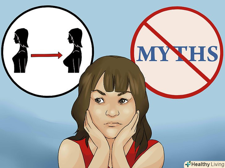 Забудьте міфи про те, що на розмір зростаючої грудей можна вплинути.на жаль існує досить багато міфів про розвиток грудей і контролі над цим процесом. В цілому ж, не може бути ніякого контролю над розвитком грудей і її остаточним розміром. Не існує ніяких фізичних вправ, які допоможуть вам зробити свої груди більше або менше. Молочні залози, в основному, складаються з жирових тканин і молочних проток, а не м'язів. Навіть якщо ви спробуєте спати на животі, це жодним чином не вплине на вашу груди (крім того, що при підвищеній її чутливості вам буде просто некомфортно).[9] аналогічним чином, застосування бюстгальтера не допоможе вам збільшити або зменшити груди, навіть якщо ви не будете знімати його на ніч (що зовсім не обов'язково).[10][11]