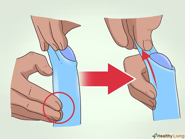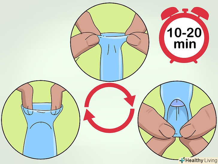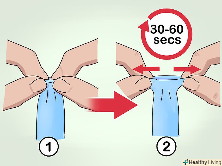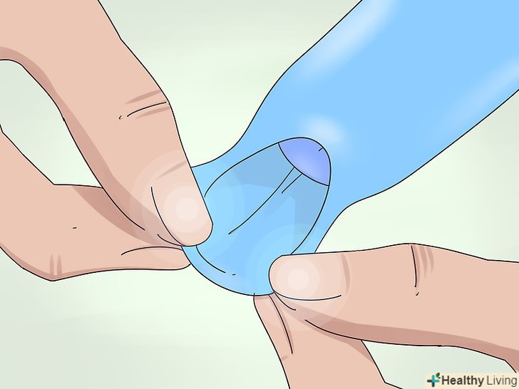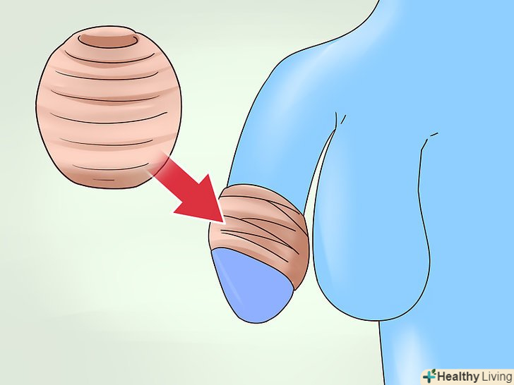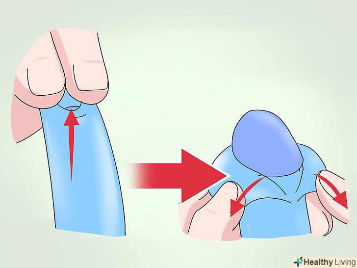 Для розтягування захопіть пальцями краю крайньої плоті.якщо головка пеніса видно в отворі крайньої плоті, але воно занадто вузьке, щоб ввести туди пальці, почніть розтягувати шкіру, взявшись за її краї. Великим і вказівним пальцями візьміться за крайню плоть з обох сторін. Акуратно розтягніть крайню плоть. Утримуйте її в такому положенні від 30 до 60 секунд, потім повторіть.[2]- Виконуйте цю вправу протягом декількох хвилин до трьох разів на день.