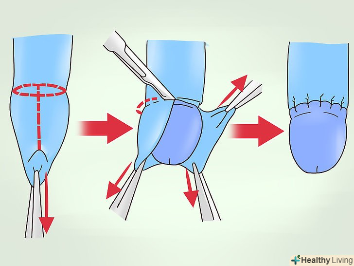Розгляньте можливість обрізання.при обрізанні (циркумцизії) крайню плоть видаляють хірургічним шляхом. Це не найпоширеніший спосіб лікування фімозу, але в рідкісних випадках це єдино вірний вихід. Обрізання зазвичай рекомендується в тих випадках, коли не допомагають мазі і розтягування, коли затискається крайня плоть, коли чоловік страждає від регулярних запалень або при інших фізіологічних проблемах.[17]